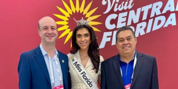 En la fotografía principal, de izquierda a derecha: Christopher Follenus, International Manager de Visit Central Florida; Casana Fink, Miss Florida 2024-2025 y Víctor Manjarrés, Presidente...