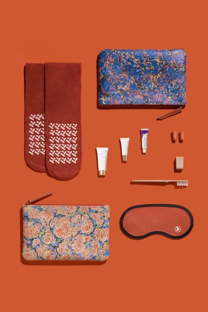 Cada kit, una interpretación moderna del arte tradicional turco, incluye una loción para manos y cuerpo y un bálsamo labial formulados por la marca de fragancias de lujo Ex Nihilo. Además, alrededor del 80% de los materiales utilizados en artículos como calcetines, máscaras oculares y cepillos de dientes proceden de materiales reciclados y opciones sostenibles como el almidón de maíz biodegradable.
